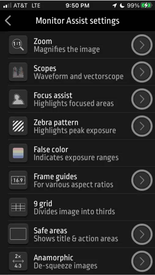 The app communicates wirelessly via Bluetooth LE to perform remote configuration and operation tasks. Input options let you select connection type, select gamma/EOTF, and adjust gamut settings. For monitoring, AtomRemote can control playback, select dynamic-range settings, apply custom 3-D LUTs, and use default color-space transformations. Output controls provide options for 4K-to-HD downconversion and HDR output. In addition to starting and stopping a recording, AtomRemote can activate a full suite of image-analysis tools, including exposure and focus assistance.