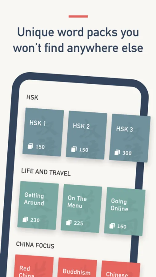 Need to read a Chinese menu, talk to your landlord, or survive study abroad? Our word packs will teach you the essential words you need to know if you are traveling, living, or studying in China.