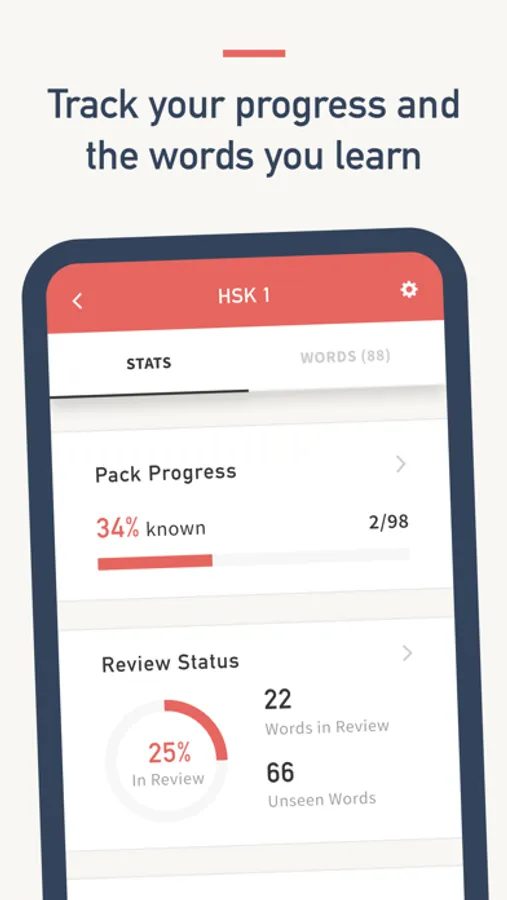 Create daily reviews from useful, practical word packs that contain over 9,000 total words. Learn the basics, get ahead at work, pass the HSK, survive abroad, and more. The words you master are recorded so that you always know the size of your vocabulary and can track your review progress.