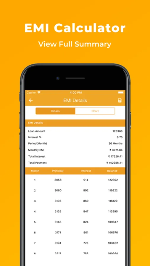 ==> Statistics shows Principal Amount, Interest rate and remaining balance per month.