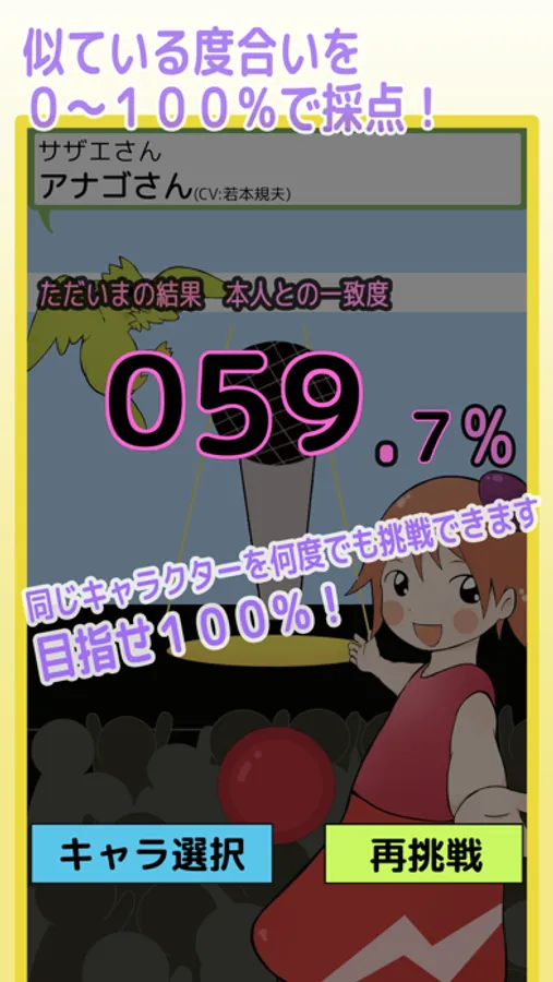 音声認識AIを使って、アニメキャラの声とあなたの声がどれだけ似ているかを0~100%で採点します。