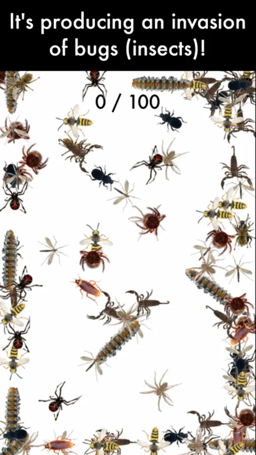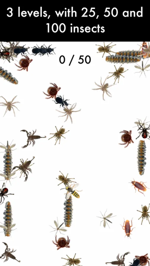 - In white background there are 3 levels, with 25, 50 and 100 insects. Each level insects go faster and are more difficult to hunt.
