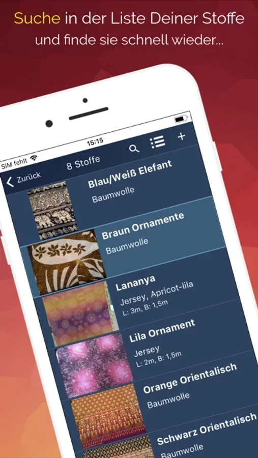 Die App kann Dir auch helfen, wenn Du unterwegs bist, einen Stoff zu kaufen oder rein zufällig in einem Stoffladen landest. Dann kannst Du mit dem gemachten Foto direkt im Laden nachschauen, ob der neue Stoff zu einem bereits gekauften Stoff passt. Oder Du stehst im Laden und brauchst einen speziellen Stoff? Dann suche, filtere danach oder sortiere und schau in Deine Favoriten.