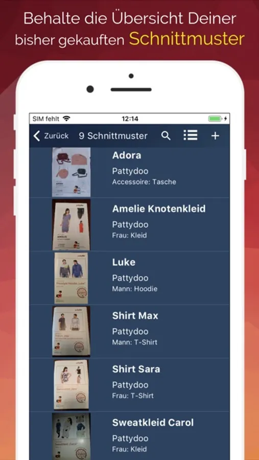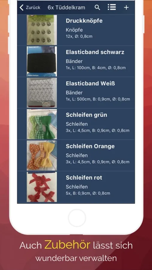 Zusätzlich kannst Du in der App auch Deine Schnittmuster, Plotdateien und Zubehör/Tüddelkram verwalten. Somit kannst Du später direkt von der Couch aus nachschauen, welches Projekt Du als nächstes angehen könntest.