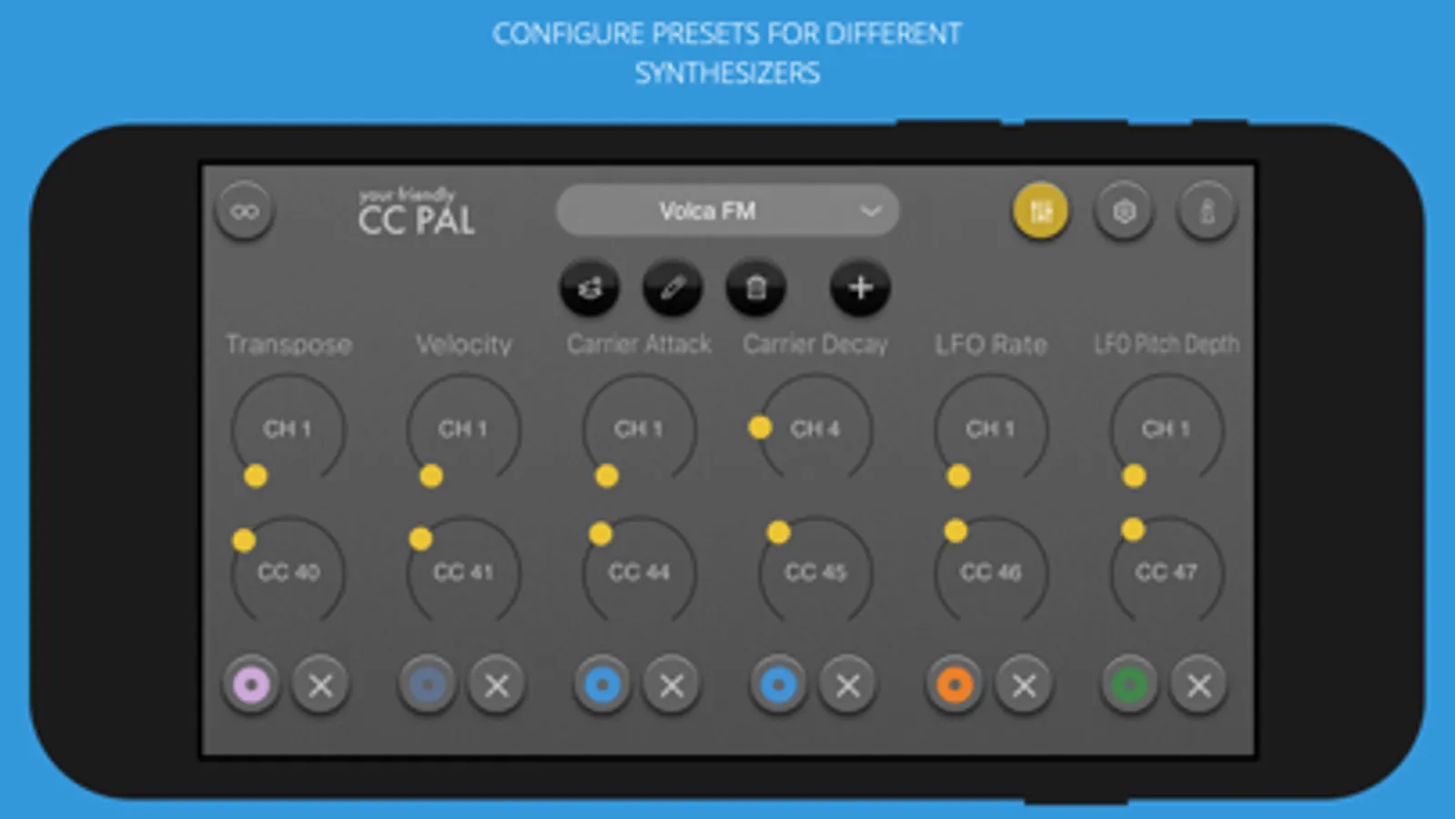Each slider can be customized with a MIDI channel, CC number, color and name. You can create unlimited numbers of configurations. The CC pal comes with couple of predefined configurations for some hardware devices like the KORG Volca FM, KORG Volca Beats, KORG minilogue XD, DSI Prophet Rev2.