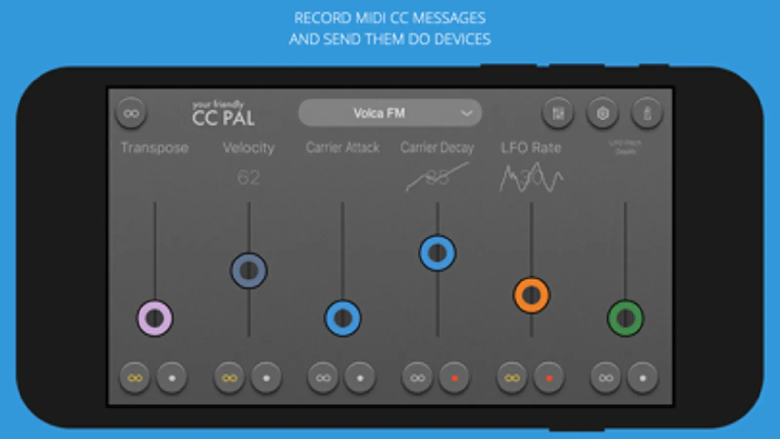 CC PAL is a MIDI CC controller which allows you to create up to 16 CC sliders. You can record movements for each slider and replay this in a loop. You can also just change the CC value by moving the slider.