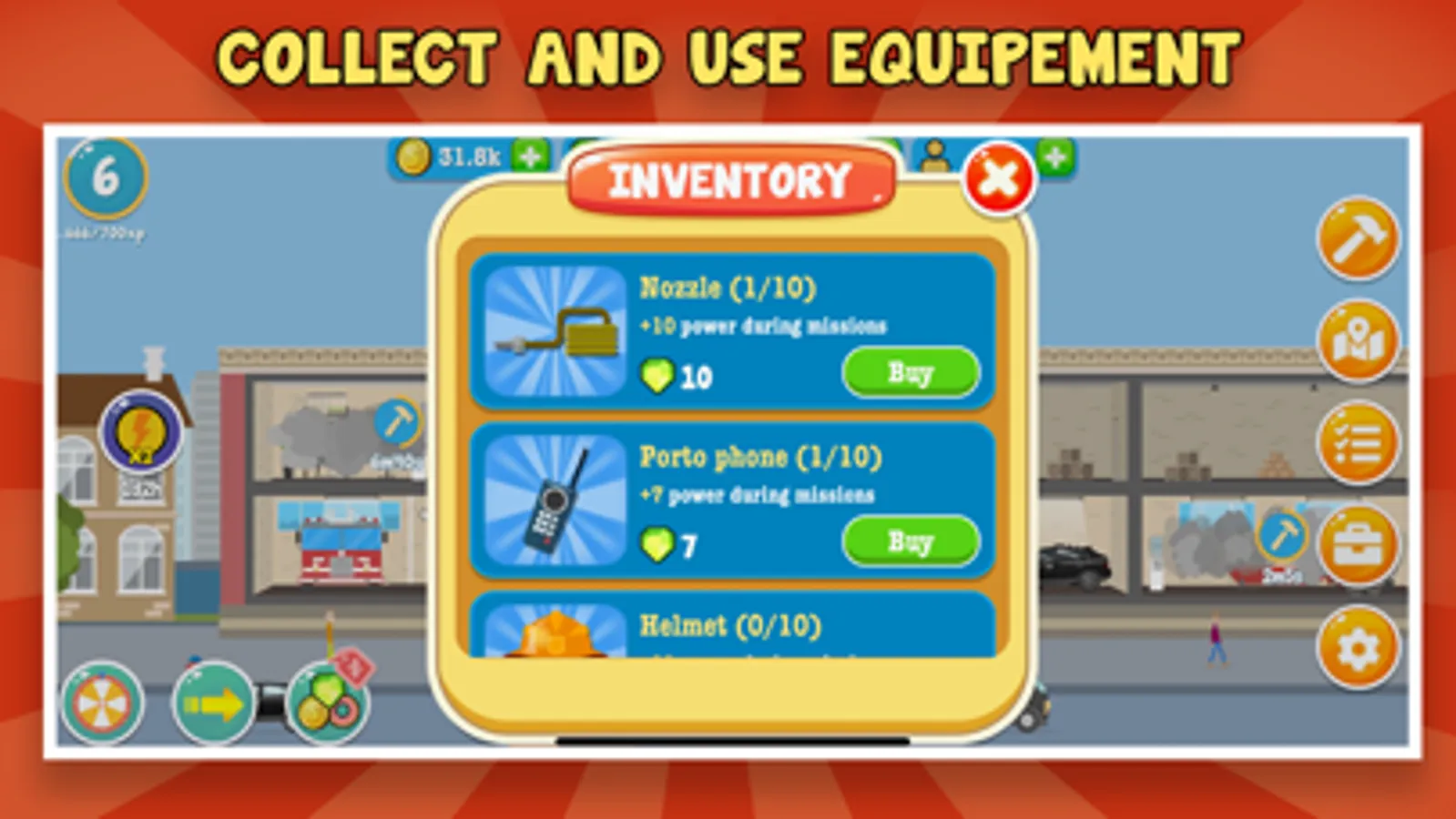 - Collect nozzles, helmets or axes to complete rescue missions easier.