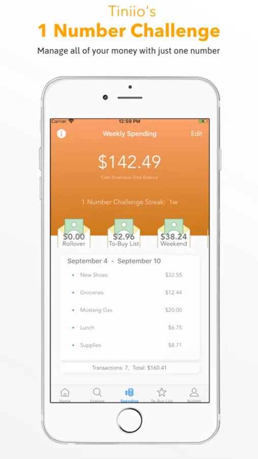 The 1 Number Challenge gives you the same amount of money to spend every week, but of course you can tailor it as needed. The way to play is to add expenses to Tiniio each time you spend. Spend your 1 Number or less, you win.