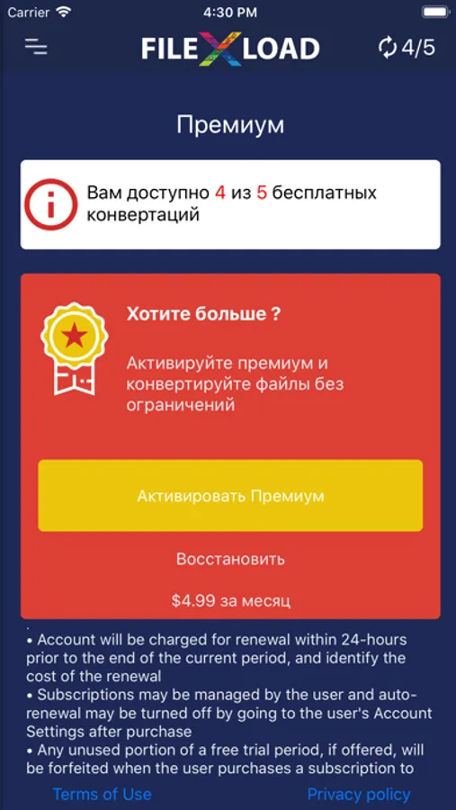 Subscription to Премиум will be charged to iTunes Account at confirmation of purchase. Subscription automatically renews unless auto-renew is turned off at least 24-hours before the end of the current period. Account will be charged for renewal within 24-hours prior to the end of the current period. Subscriptions may be managed by the user and auto-renewal may be turned off by going to your Account Settings after purchase. Any unused portion of a free trial period, if offered, will be forfeited when the user purchases a subscription to that publication, where applicable. Read our Terms & Privacy Policy here: