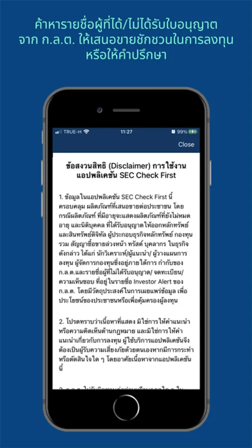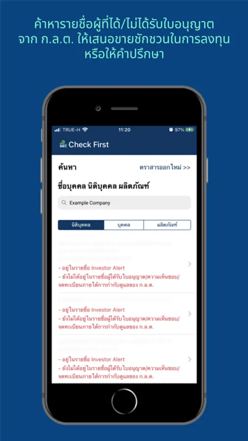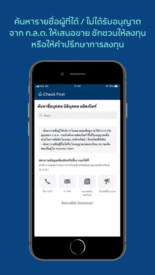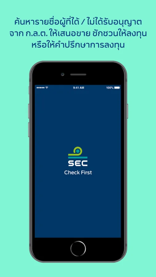 "SEC Check First" แอปพลิเคชันด้านการลงทุนในตลาดทุน โดยหน่วยงานทางการที่เป็นกลางและเชื่อถือได้ สำหรับผู้ที่ถูกชักชวนให้ลงทุนหรือใช้บริการลงทุน เช็คข้อมูลผู้ที่ได้รับ/ไม่ได้รับอนุญาตจาก ก.ล.ต. ก่อนตัดสินใจลงทุน