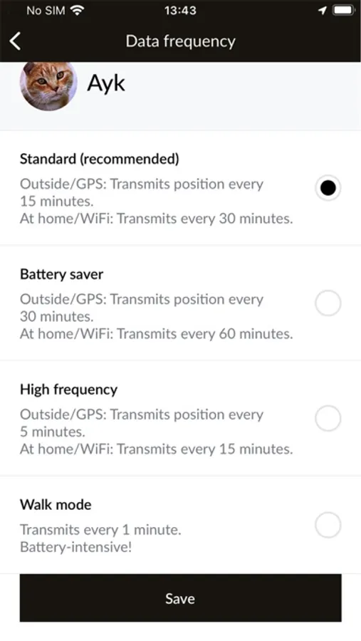 The app saves the positioning data per cat, creating a movement profile with tracking information about distances traveled, territory, or indoor/outdoor statistics.
