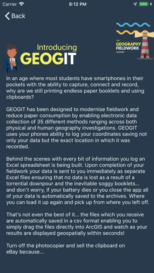GEOGIT has been designed to modernise fieldwork and reduce paper consumption by enabling electronic data collection of 35 different methods ranging across both physical and human geography investigations. GEOGIT uses your phones ability to log your coordinates saving not only your data but the exact location in which it was recorded.