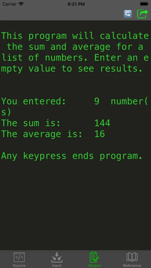 - This is a batch compiler; interactive programs are not supported. If your program provides an input prompt, enter the input in the Input tab prior to compilation. See the Reference tab in the app for code examples