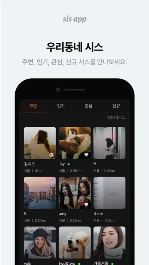 - 주변(위치기반): 내 주변 시스를 만나보세요.