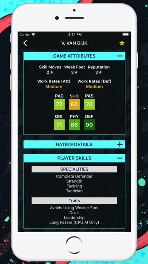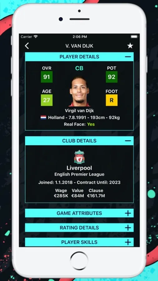 In Player Details page you are able to display very detailed data like Player Photo, Player Full Name, Preferred Positions, Preferred Foot, Date Of Birth, Height, Weight, Contract End Date, Wage, Value, Release Clause, Specialties, Traits, Weak Foot, Skill Moves, Work Rates, Total Stats and Player Ratings Per Positions.