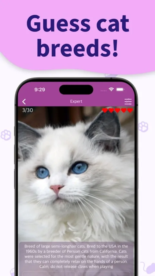 This is a great educational game for anyone who loves and knows cats. Guess the breed of cats! Test your knowledge!