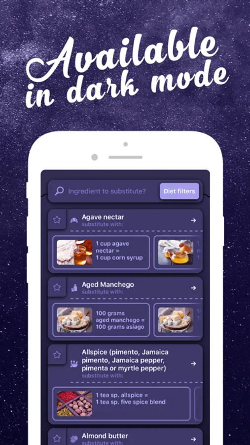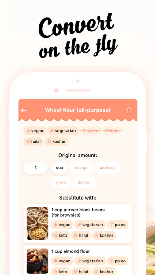 • Enter your original ingredient amount and the app will calculate substitution ingredient amount for you automatically