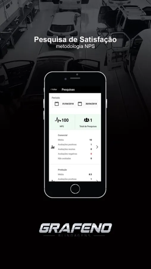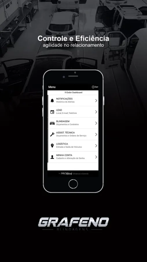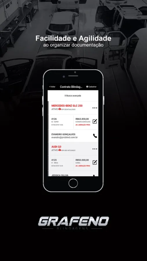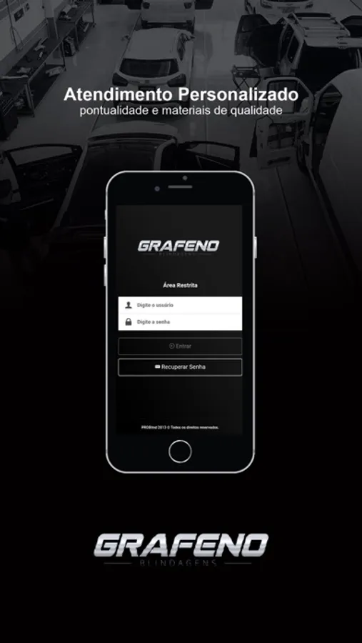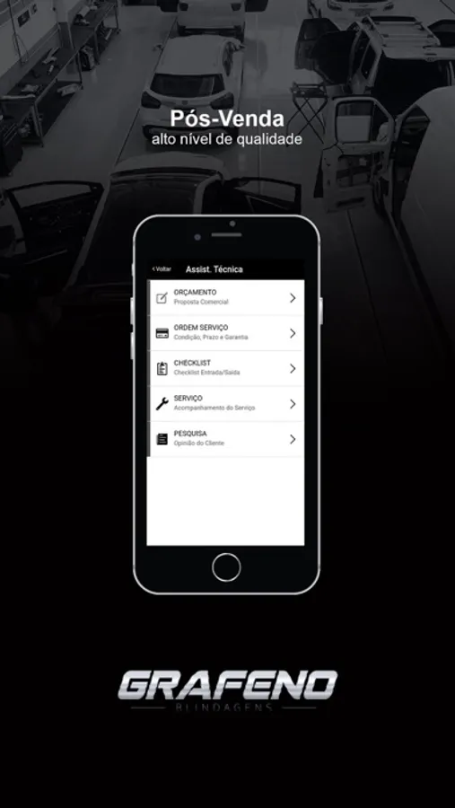Todos os clientes da GRAFENO podem utilizar o aplicativo e acompanhar o andamento da blindagem do seu veículo, assim como acessar dados da venda/contratação.