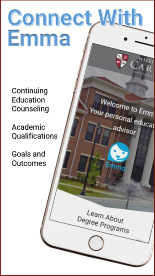 Emma is a free enrollment advisor that is a fast, straightforward way to gain valuable information and learn of the steps needed to begin your degree program. As a representative of the school, Emma is available 24/7 with information at your fingertips.