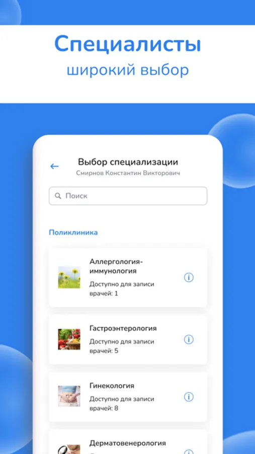 — узнать информацию обо всех специалистах сети, выбрав подходящего;