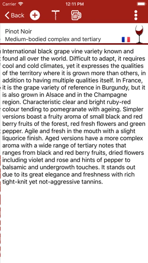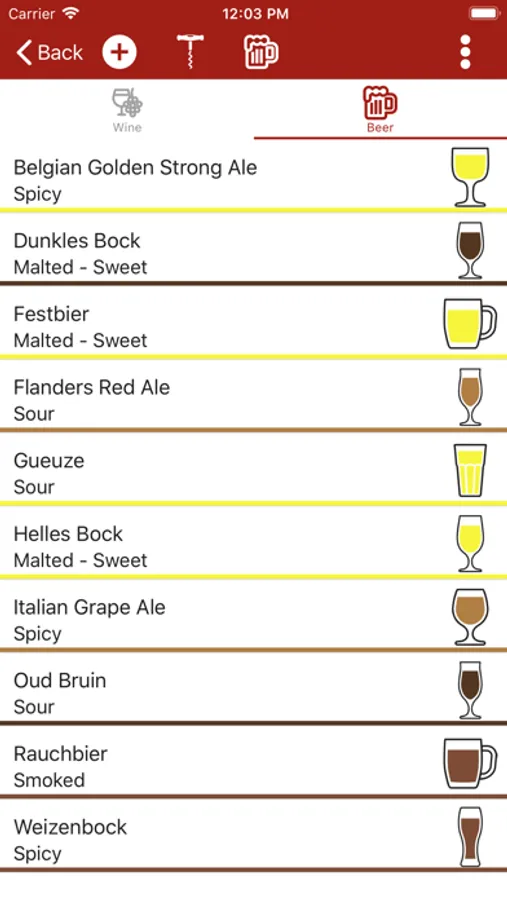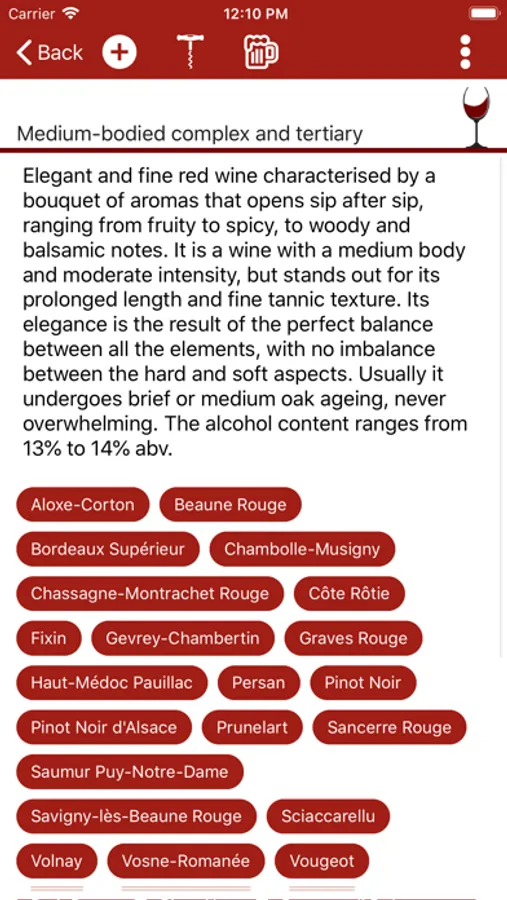 - The Testing Option makes it possible to taste multiple wines respecting the correct order. Just tap on the glass of the wine selected and empty its contents. The system will carry out the following research considering only equivalent or superior wine types.