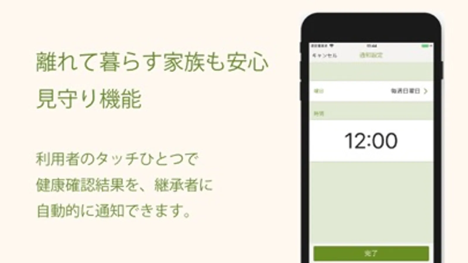 毎日、ユーザーがあらかじめ設定した時刻に、アプリを通じて健康確認が行われます。ユーザが健康確認を行うと、大切な人へ通知されるから本人も家族も安心。