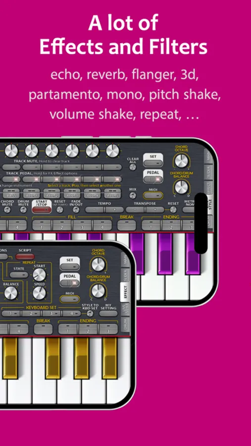 • Thousands of rhythms, Including Intros, Variations, Fills, Break, Endings, and Pads, with Real chords (Press 3 or more keys) such as Pop, Jazz, Rock, Arabic, Turkish, Hindi, …