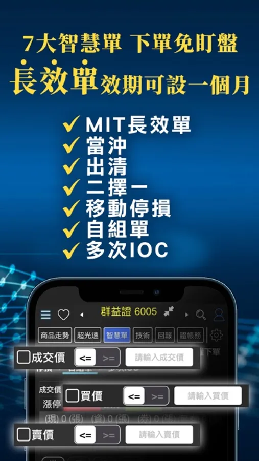-程式智慧單:逐筆交易行情免盯盤,設定買/賣價格及停損/停利等條件,條件滿足自動下單。