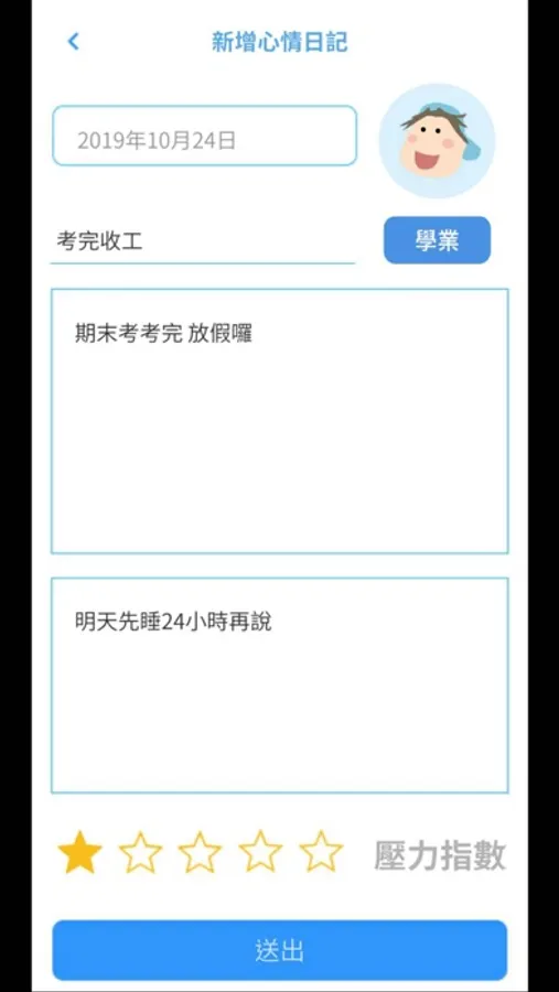 「心情日記」功能,使用者可以記下每天的心情,透過可愛的圖示與分類標籤,紀錄快樂事件並能了解造成壓力的原因,方便隨時檢視自己情緒起伏的原因。