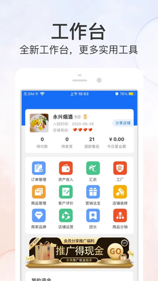 手机开店用优品街商家版,1分钟掌握店铺动态,1站式搞定日常经营!