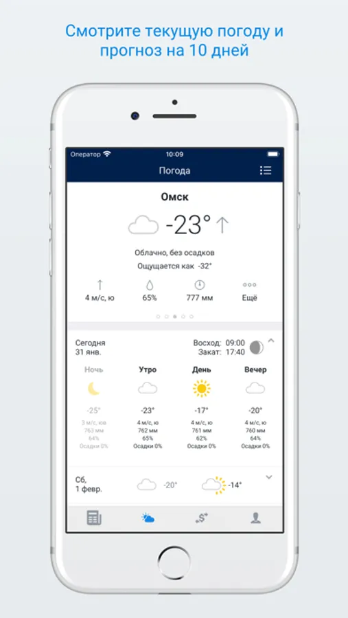 - смотреть текущую погоду и прогноз на ближайшие 10 дней;