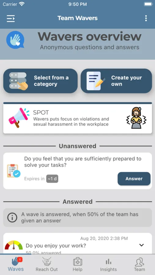 The Wavers team app is the employees' very own tool for increasing well-being and creating a healthy culture in the workplace.