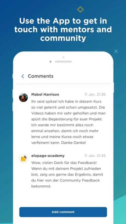 In our elopage Academy, you'll learn how to build your business with elopage: From the Pro Challenge to the Design Challenge, to the GDPR and e-Book course, as well as the upsell mini-course. Check them out on the go, answer quiz questions, and use the comment feature. Download all content to your smartphone to have your courses available at all times!
