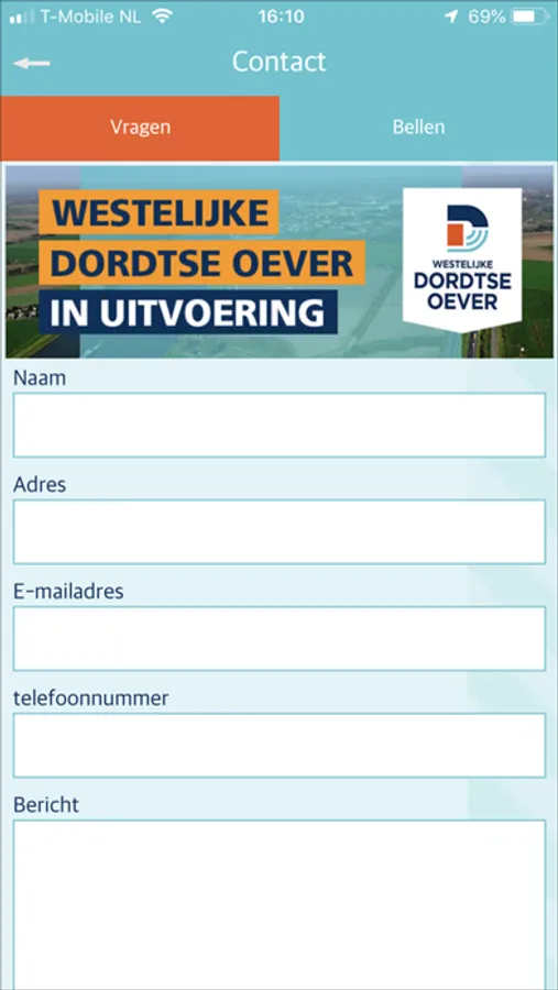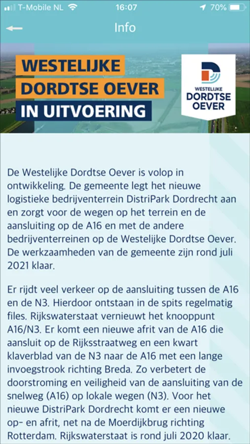 In deze app vindt u alle informatie over de werkzaamheden van het project Westelijke Dordtse Oever in Dordrecht. Er wordt belangrijke projectinformatie, de laatste planning en contactinformatie weergegeven . Ook kunt u op deze app vragen, opmerkingen of klachten achterlaten die betrekking hebben op het project.