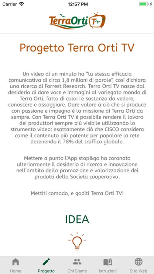Terra Orti ha scelto di realizzare il portale video e l’Applicazione “STOP&GO” per venire incontro all’esigenza sempre più reale di una alimentazione gustosa, sana ed equilibrata a base di frutta e ortaggi, accessibile a tutti grazie all’innovazione tecnologica e alla semplicità delle ricette.