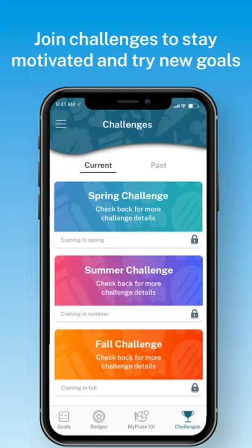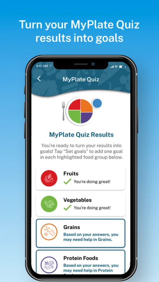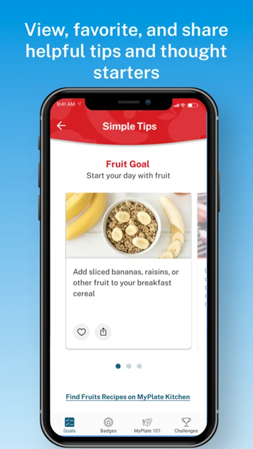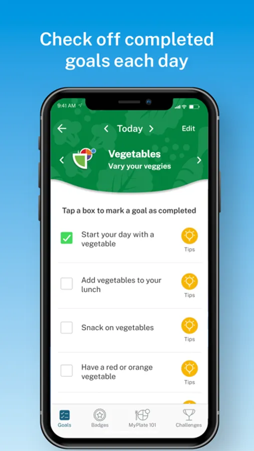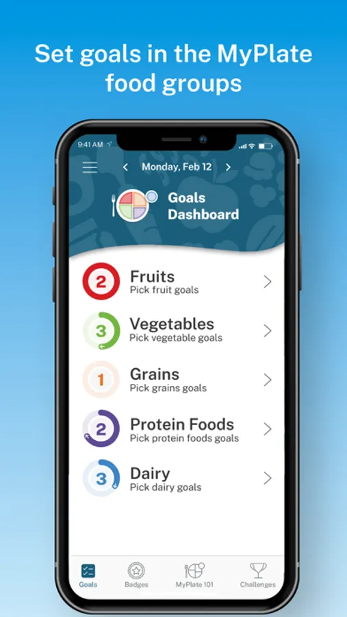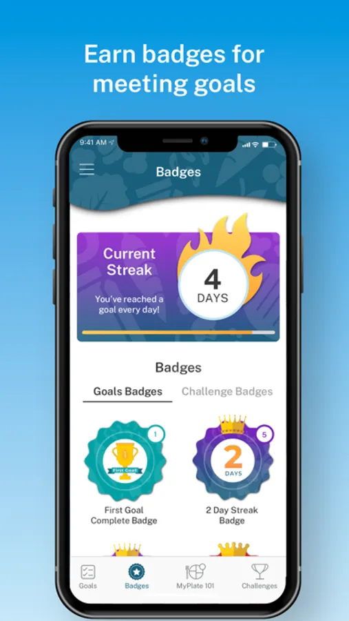 - Collect a variety of badges such as first goal complete, daily-streaks, food group badges, and the ultimate MyPlate badge