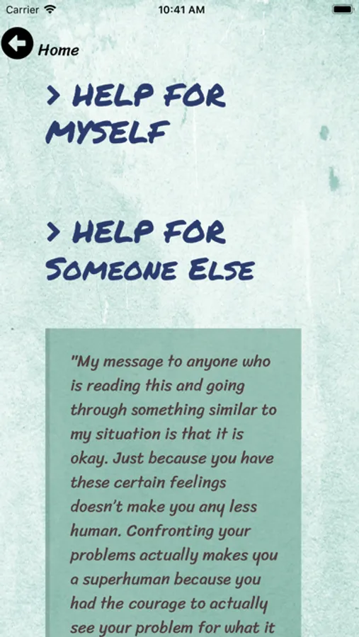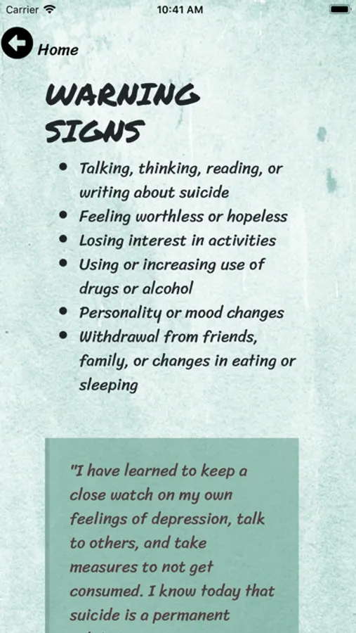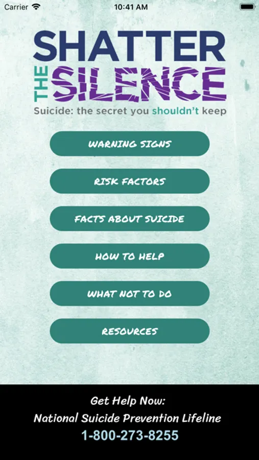 Shatter the Silence Suicide mobile application is an excellent resource to learn more about preventing suicide. The application includes information about risk factors, warning signs, helpful and unhelpful things to say and a variety of resources available to yourself, or someone you know, who may be at risk or contemplating suicide. The application features encouraging messages of support and hope, and quick access to the National Suicide Prevention Lifeline which has trained counselors available to help 24/7 to help those in need.