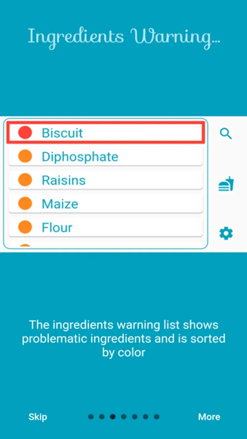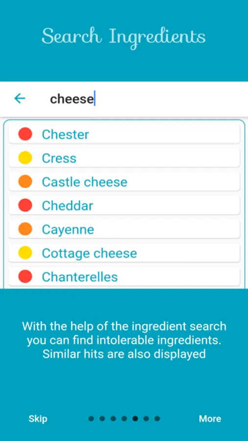 With the Ingredients search function you can search for specific ingredients. Similar ingredients are also found and sorted by degree of intolerance.
