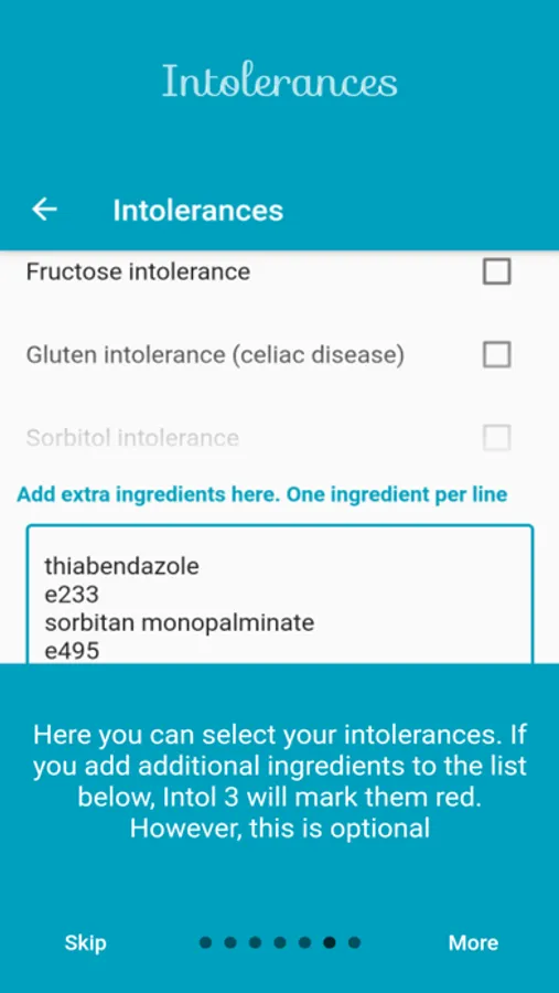 If you want to add your own ingredients that you don't tolerate, just add them to the app settings. Intol 3 will then mark them red when scanning and searching for ingredients.