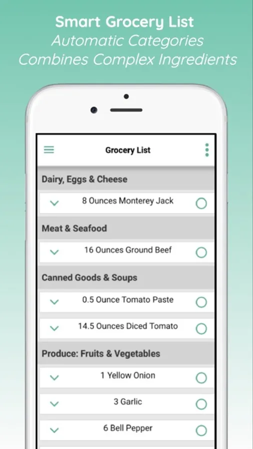 Recipes are combined and broken down into items you can buy in the grocery store.