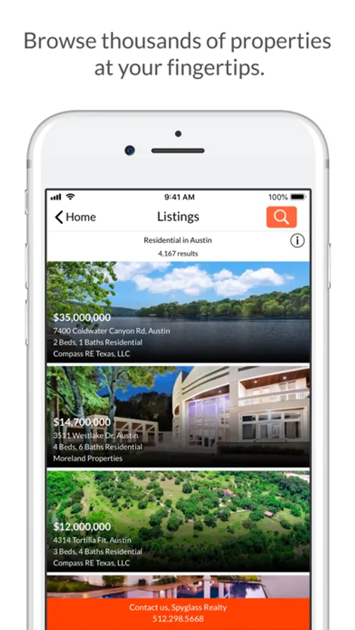 Download Spyglass Realty and search all homes, condos and lots for sale in the Austin area. Use the interactive map search to find homes for sale as you drive around. Save your favorite listings to get notified about price changes and status changes. Save your search preferences to receive immediate notifications as new listings hit the market. Connect directly with your Agent to share your favorites, ask questions and request showings.