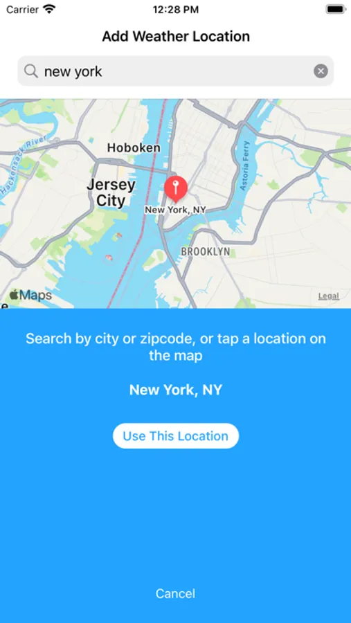 * Location selection from either a map tap or search
