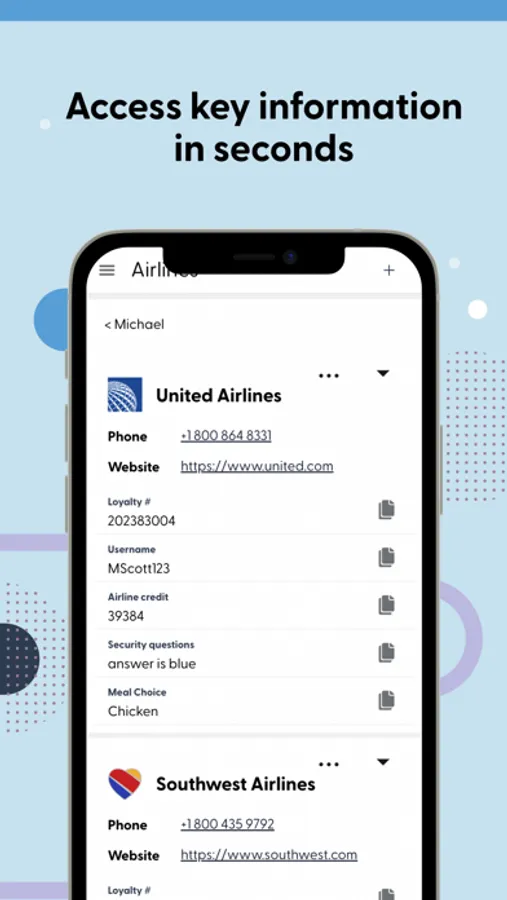 Whether you're working from your desk or from your kids' soccer game, Cabinet keeps all your and your team's key details at your fingertips, yet encrypted and out of the hands of hackers. Store loyalty numbers, unused airline credits, favorite restaurants, spouses' birthdays and so much more.