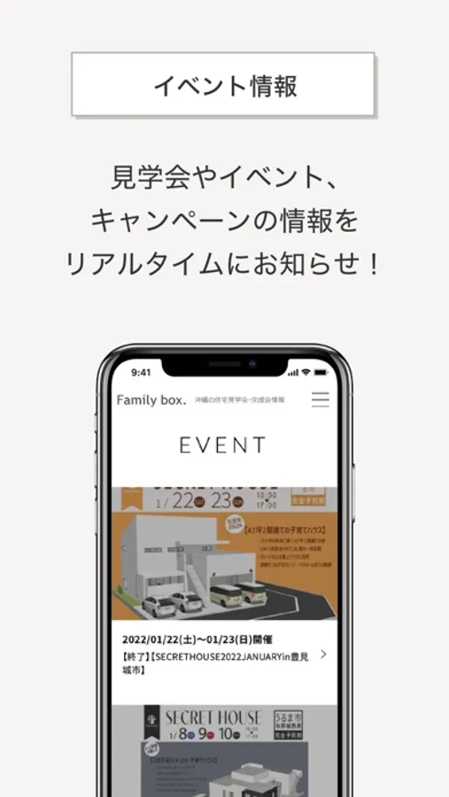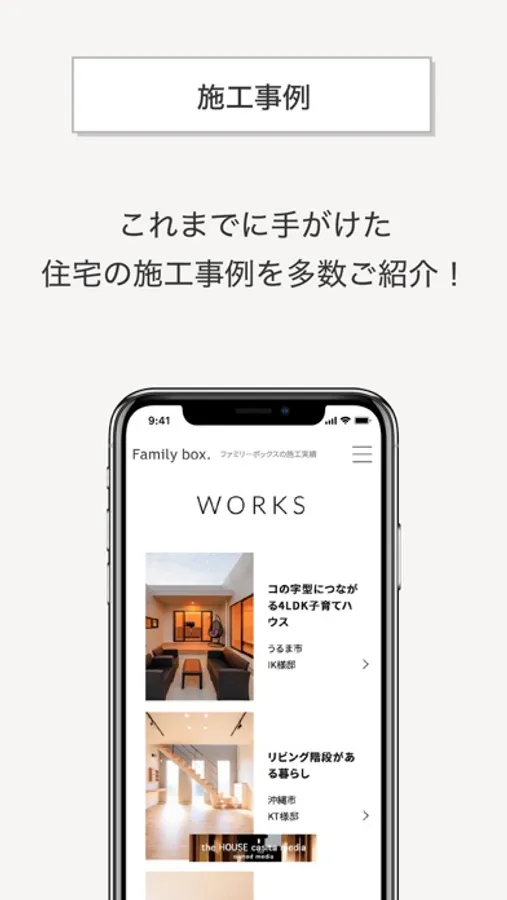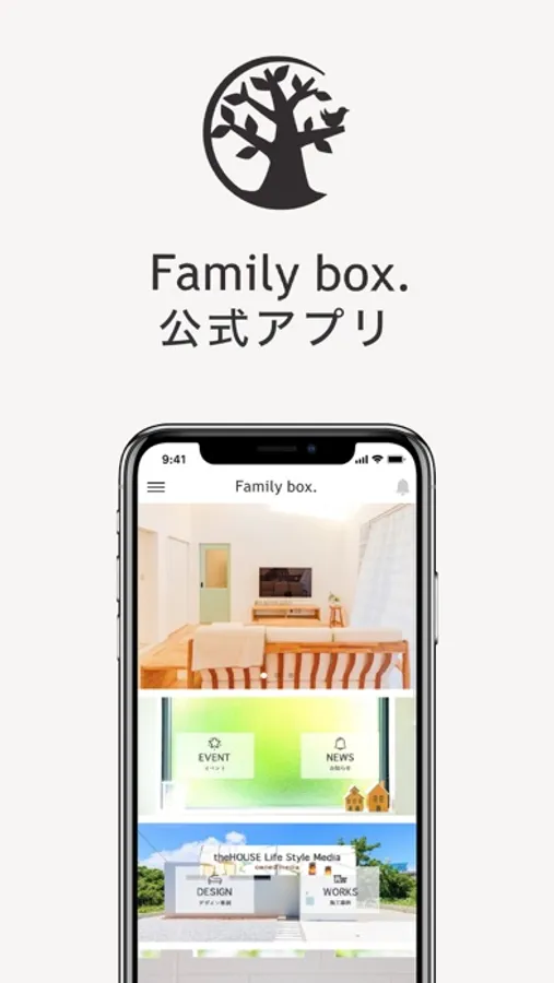 このアプリは、これから家づくりをはじめるお客様・ファミリーボックスで家づくりをしていただいたお客様に、新着情報やお役立ち情報をお届けできるようにと開発しました。