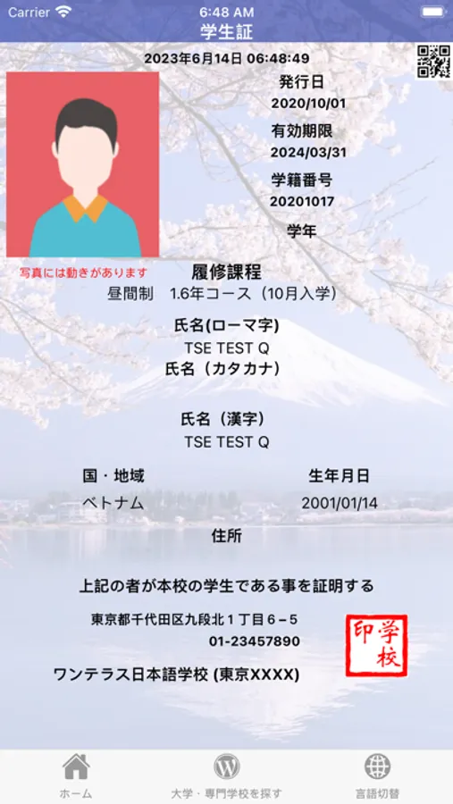 日本語学校入学後、学生証として利用可能です。また、学校からの連絡の受け取り、出席率確認、在留資格情報や連絡先情報、アルバイト先情報の登録・変更を学生本人が申請できます。