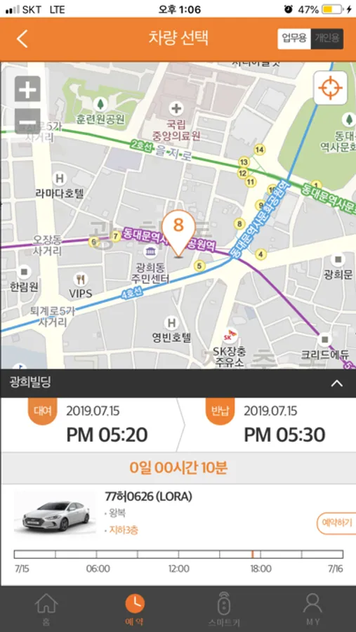 - 지도 또는 스케줄 기반으로 주차장 및 차량 선택 후 예약