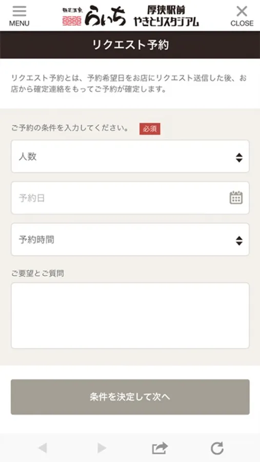 希望の人数・日時を指定して送信するだけで予約を依頼できます。