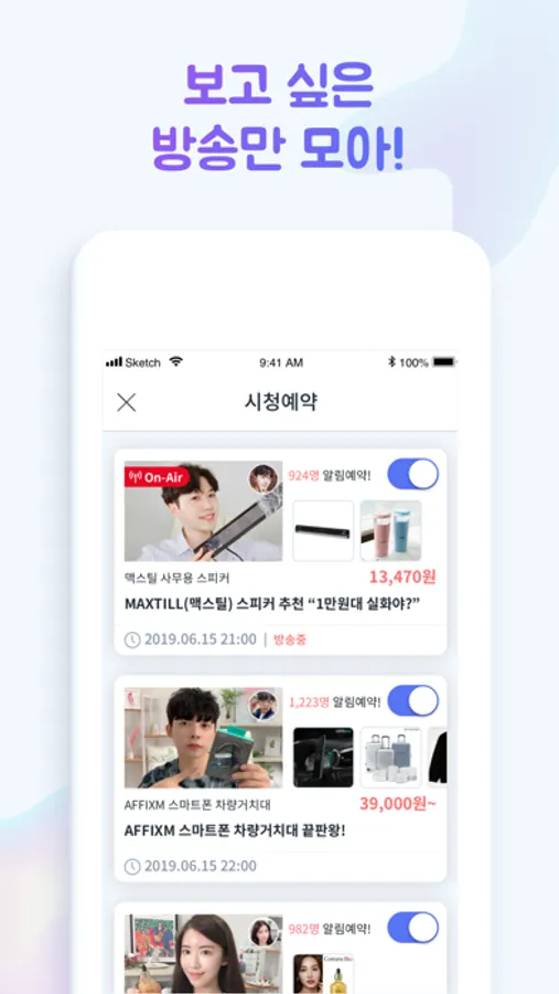 라이브 방송 편성표를 한 눈에 모아 보고, 꼭 시청하고 싶은 방송이 있다면 알림을 예약해보세요.