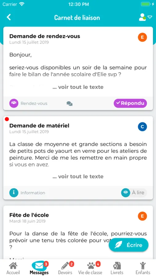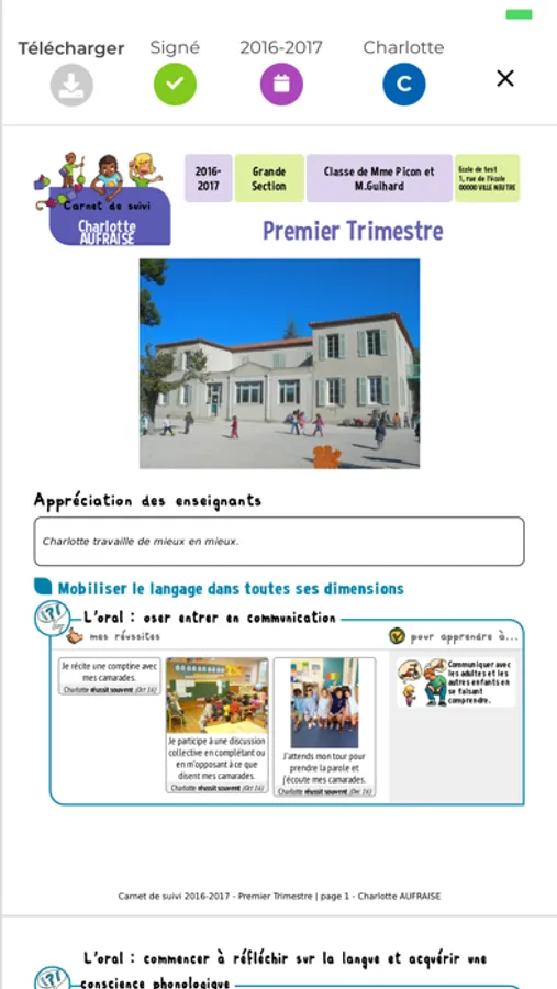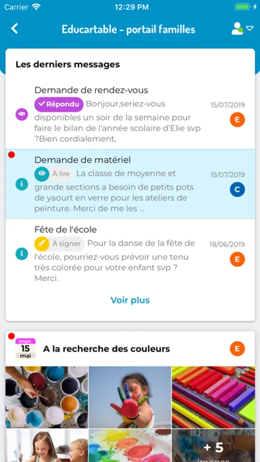 L'application Educartable - portail familles permet aux parents de consulter les devoirs, de signer les messages du carnet de liaison, d'écrire à l'enseignant, de signer les livrets de compétences et de prendre connaissance des événements du cahier de vie.