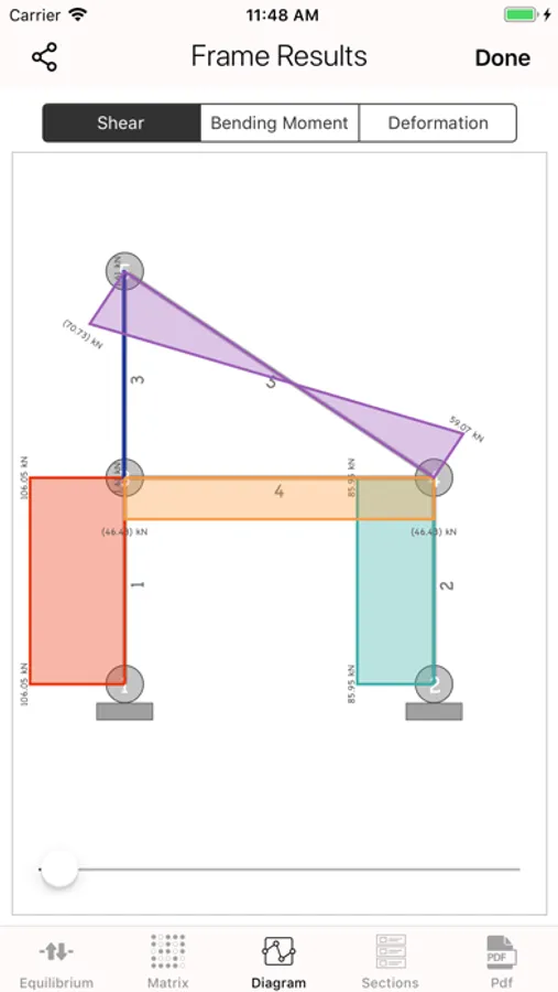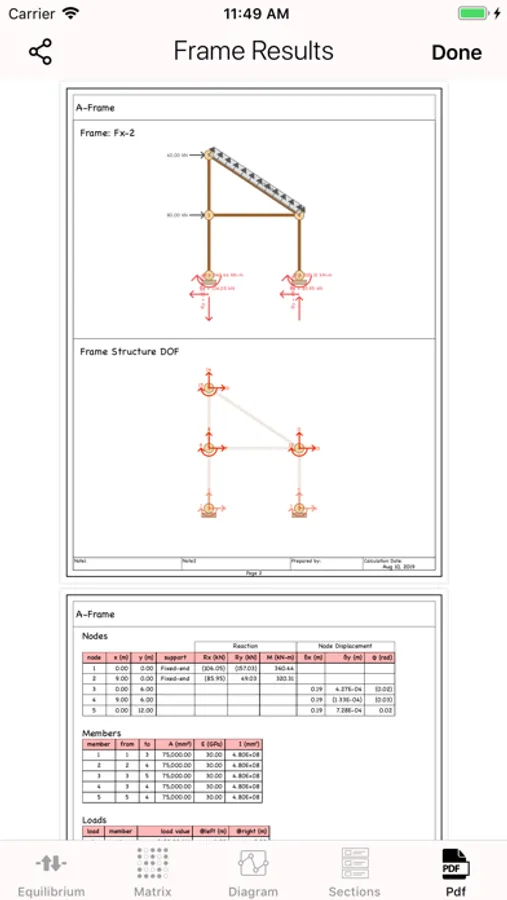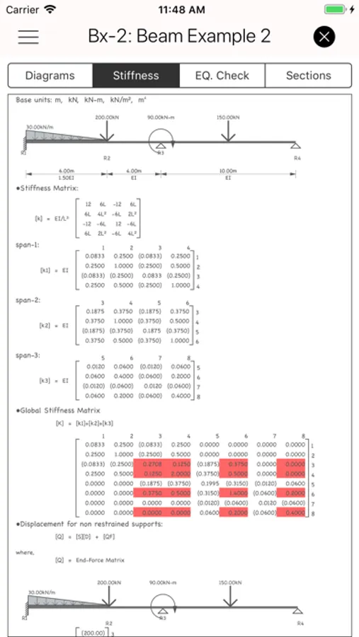 Stiffness Matrix, Equilibrium checks, Section forces, Shear Force Diagram, Bending Moment Diagram, Deflections